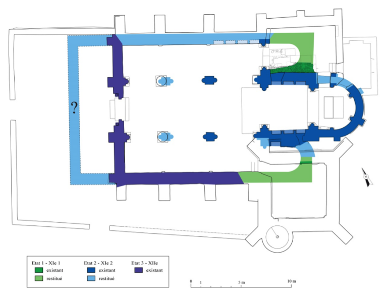En 2017, l’ouverture d’un sondage, dans la chapelle nord, a permis de mettre au jour les fondations de l’absidiole nord, inscrite dans un chevet plat. Les relations stratigraphiques et la typologie de la construction montrent qu’elle appartient à un état antérieur à la fin du XIe siècle.